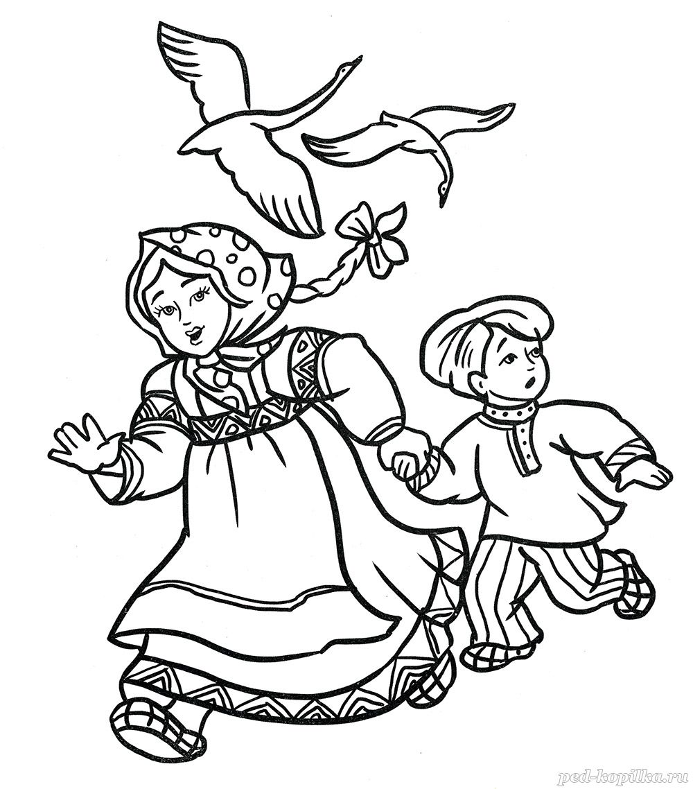 Девочка схватила его и побежала. А в погоню за ней – гуси лебеди.