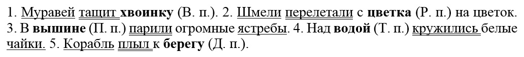 1. Муравей тащит хвоинку (В. п.). 2. Шмели перелетали с цветка (Р. п.) на цветок. 3. В вышине (П. п.) парили огромные ястребы. 4. Над водой (Т. п.) кружились белые чайки. 5. Корабль плыл к берегу (Д. п.).