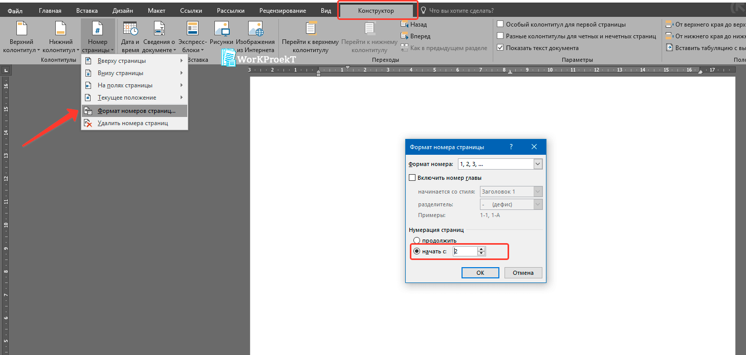 Если проектная работа отправляется руководителю на проверку без титульного листа, а также в том случае, если титульный лист и проектная работа на печать отправляются по отдельности следует пронумеровать работу со 2 страницы, то есть на листе «Содержание» необходимо поставить цифру 2, для этого необходимо во вкладке «Вставка» или «Конструктор» нажать на кнопку «Номер страницы» далее в выпадающем меню выбрать раздел «Формат номеров страниц», в открывшемся окне в блоке настроек «Нумерация страниц» выбрать «Начинать с» и в поле указать цифру 2 (как показано на рисунке, представленном ниже). Не забудьте проверить нет ли нумерации на титульном листе перед печатью.