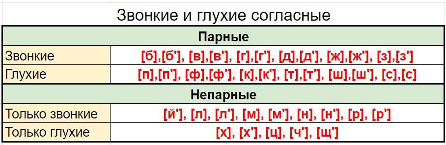 Сводная таблица парных согласных с учетом твердости и мягкости