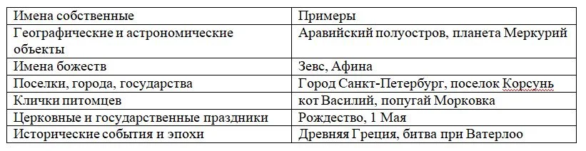 Какие наименования еще входят в категорию собственные имена существительных и пишутся с заглавной буквы? Давайте изучим таблицу.