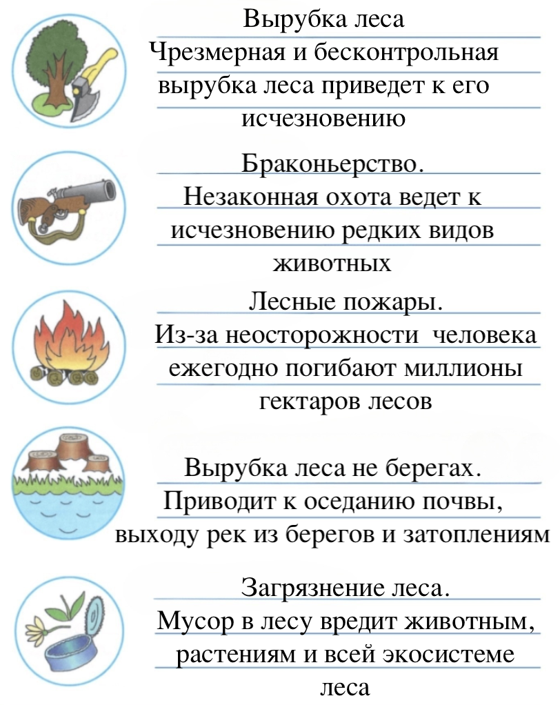 Подумайте, какие экологические проблемы лесных зон выражены этими знаками. Сформулируйте и запишите.