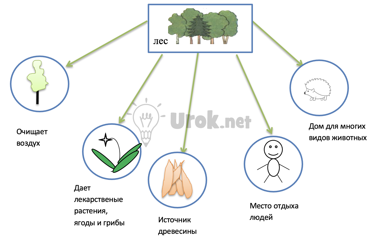 Лес очищает воздух, растения перерабатывают углекислый газ в кислород. По лесу приято и полезно гулять. Он даёт нам древесину, лекарственные травы, грибы и ягоды. Лес – это дом для многих видов диких животных.