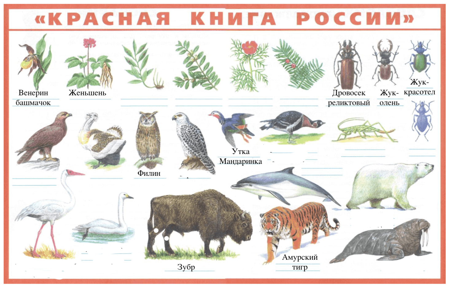 Продолжи заполнение плаката «Красная книга России», который нарисовал папа Сережи и Нади. Найди на плакате растения и животных лесных зон и подпиши их названия.