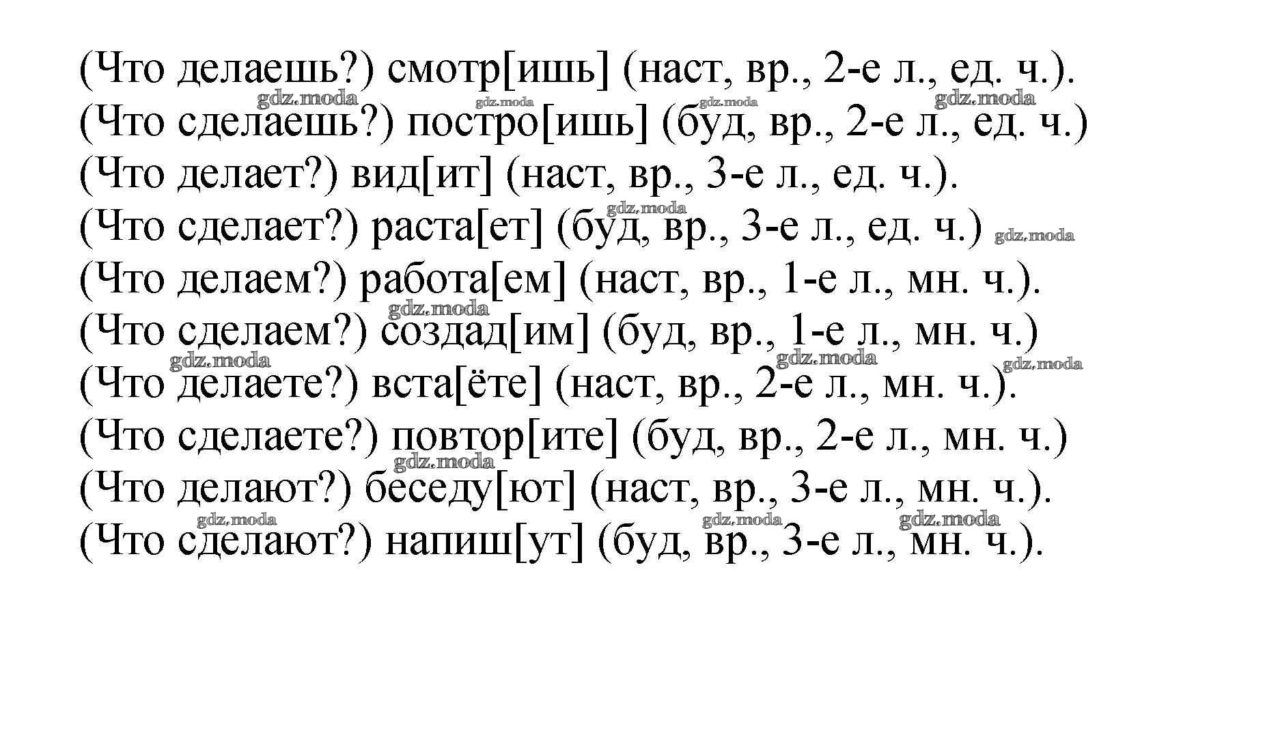Ответы к упражнению 168Прочитайте. Напишут, работаем, видит, повторите, смотришь, растает, создадим, построишь, дорожу, беседуют. • Соотнесите каждый глагол с тем вопросом, на который он отвечает. • Запишите каждый вопрос, а рядом с ним глагол, который отвечает на этот вопрос. • В скобках укажите время, лицо, число глагола. Выдели те личные окончания.