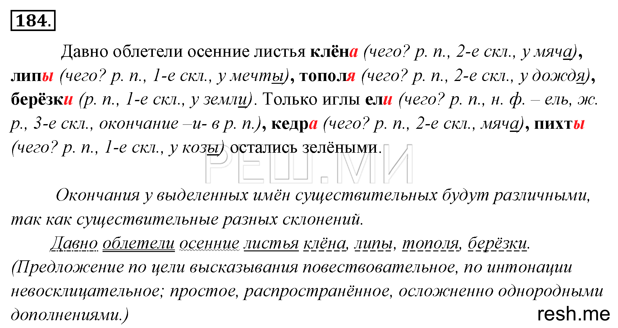 Давно облетели осенние листья клёна, липы, тополя, берёзки. Только иглы ели, кедра, пихты остались зелёными. Листья (чего?) клёна (Р. ), липы (Р. ), тополя (Р. ), берёзки (Р. Иглы (чего?) ели (Р. ), кедра (Р. ), пихты (Р. Окончания будут разными. Это зависит от типа склонения. Чтобы поставить окончания существительного, надо определить его падеж, склонение. Если окончание безударное, можно проверить себя по слову того же склонения, где окончание ударное. Давно облетели осенние листья клёна, липы, тополя, берёзки. (Предложение повеств. , невоскл. , простое, распр. с однородными дополнениями)