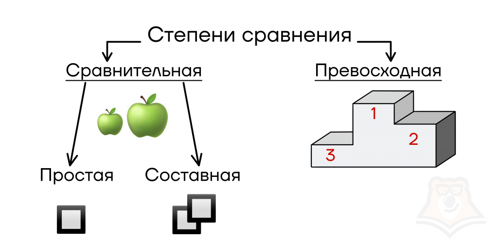 | Почему степени сравнения похожи на коктейли?Можно представить все эти правила в виде коктейля. У нас есть несколько ингредиентов:1. простая сравнительная форма: вкуснее;2. слово быстрее;3. слова более или менее;4. наречие: вкусно.Первый сок может быть самостоятельным блюдом, либо его можно соединить со вторым ингредиентом, чтобы получить превосходный коктейль. Однако третий и первый ингредиент не сочетаются:более вкуснее — ошибка Третий и четвертый соки можно смешать:более вкусно |