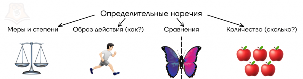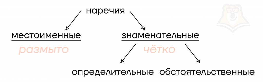 “Четкие” наречия можно разделить на две группы: определительные и обстоятельственные. Они так называются из-за связи с членами предложения: определениями и обстоятельствами. Давайте рассмотрим их внимательнее.