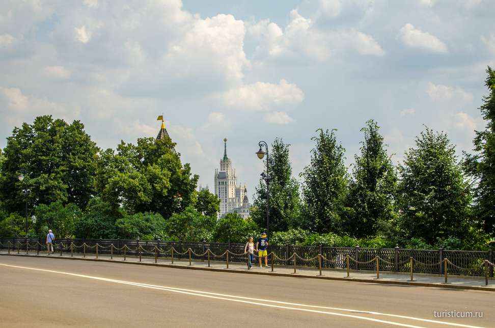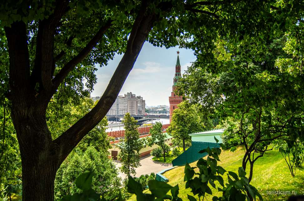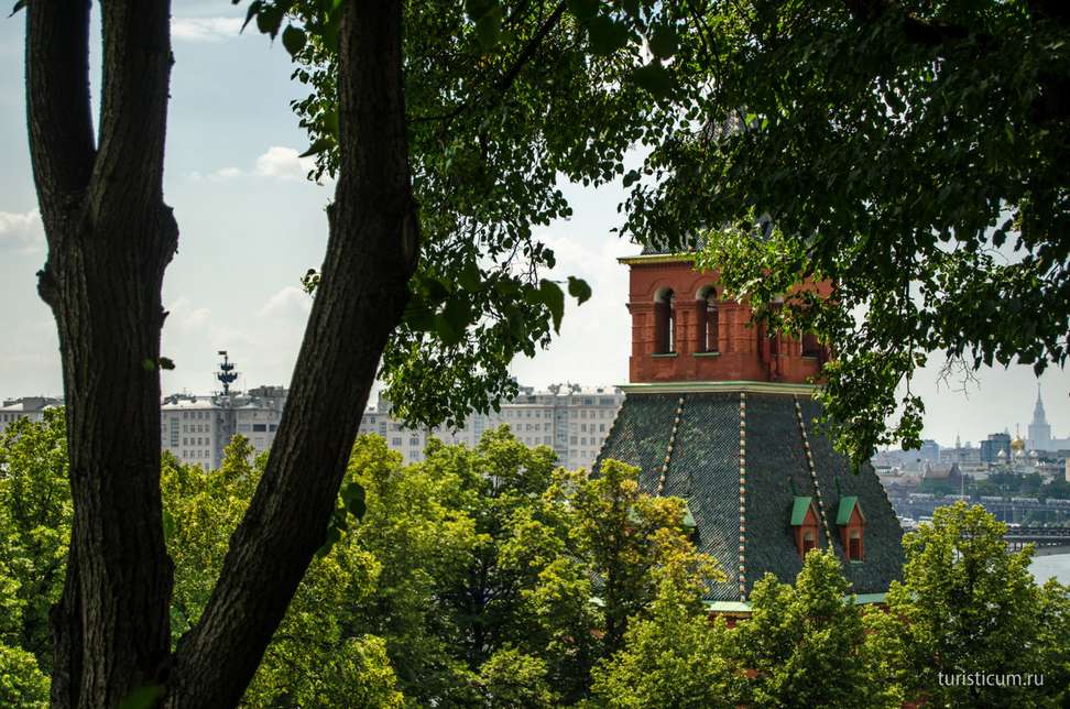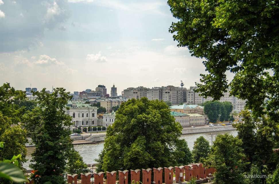 А слева видна закрытая для посещения территория Тайницкого сада и открывается чудесный вид на Москву-реку, местами он правда закрыт густой растительностью.