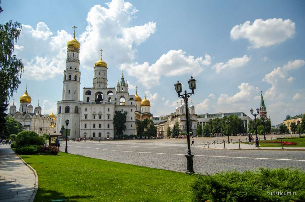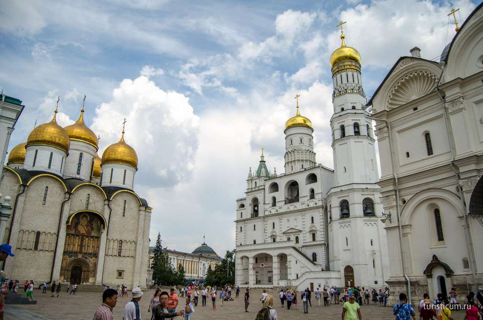 Теперь настало время посетить и Соборную площадь Кремля. Здесь нас ждет настоящая кладезь истории Государства Российского. Соборная площадь занимает самую высокую часть Боровицкого холма, а называется так именно из-за того, что на ней расположено несколько соборов и церквей. Существующий вид Соборная площадь имеет с XV века. Это историческое место является, без преувеличения, колыбелью государственности. Ведь именно в Успенском соборе (на фото в центре) проводились коронации царей, а другой собор Архангельский служил царям последней усыпальницей.