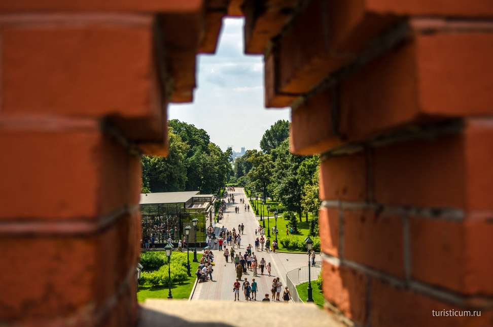 Билеты можно купить в информационно-туристическом центре Московского Кремля, который находится в Александровском саду, неподалеку от Кутафьей башни. Вид на информационный центр из бойницы Троицкого моста.