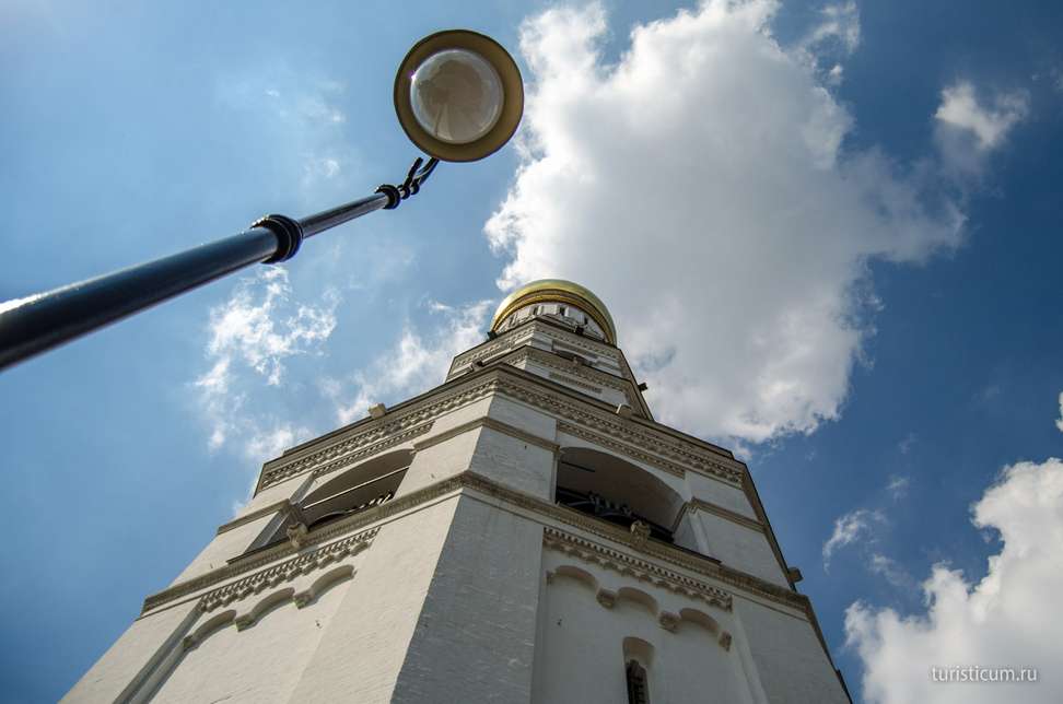 На фото между Успенским собором и Архангельским собором расположена колокольня Ивана Великого. Построена она была в XIV веке и надстроена в начале XVI века при Борисе Годунове. 81 метровая колокольня оставалась самым высоким зданием в России вплоть до начала XVIII века. Кстати, на колокольню Ивана Великого можно подняться. Для этого нужно купить билет в кассах туристического центра.
