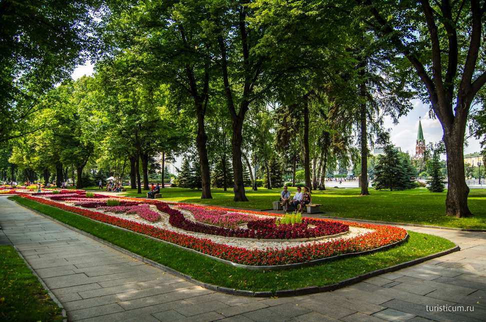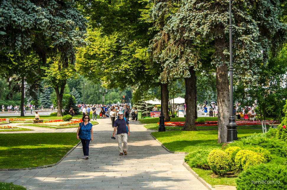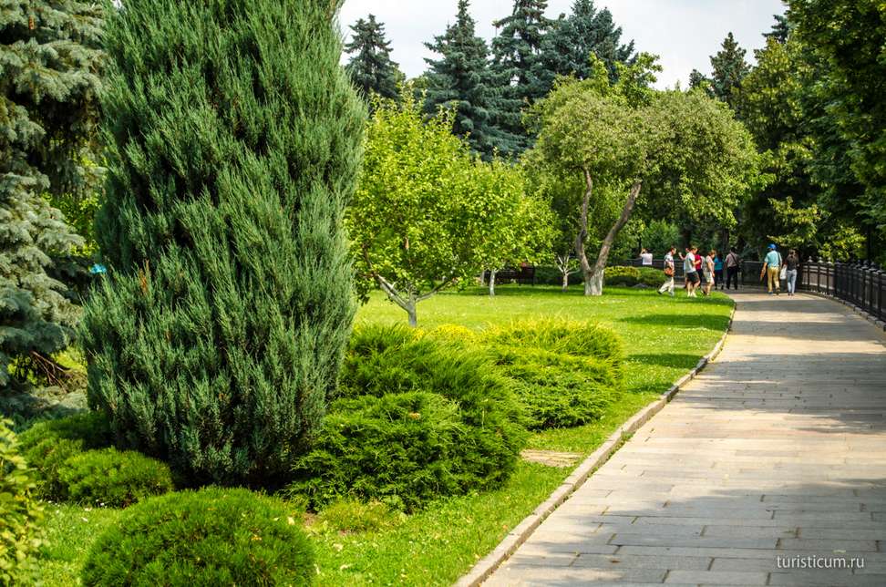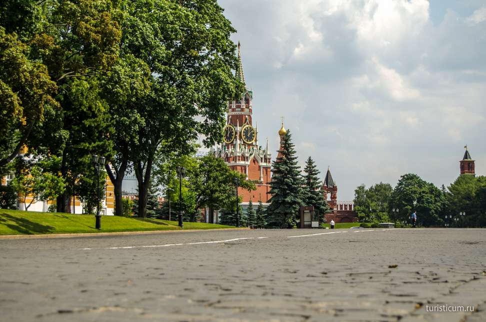 С территории Соборной площади можно выйти несколькими способами. Один из них это через Боровицкую башню, но мы делать этого не будем и выйдем через центральную башню Кремля – Спасскую, а предварительно прогуляемся по раскинувшемуся здесь же Большому Кремлевскому скверу. Он находится в верхней части Тайницкого сада и открыт для посещения.