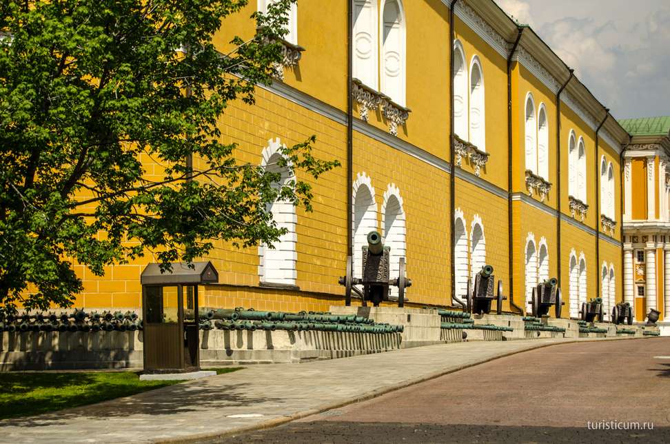 Оказываемся мы на Троицкой площади Кремля. Если смотреть от Троицкой башни, то по левую руку от нас здание желтого цвета – Арсенал. Строительство Арсенала началось по указу Петра I в 1702 году и продолжалось без малого 34 года. Правда прослужил он, по меркам истории, не очень долго. При отступлении в 1812 году, Арсенал был взорван войсками Наполеона, таким образом уцелел только фундамент. В восстановленном здании Арсенала планировали устроить музей Отечественной войны, поэтому сюда было свезено множество артиллерийского оружия того времени. Сейчас эти пушки, установленные на лафетах красуются по всему периметру Арсенала.