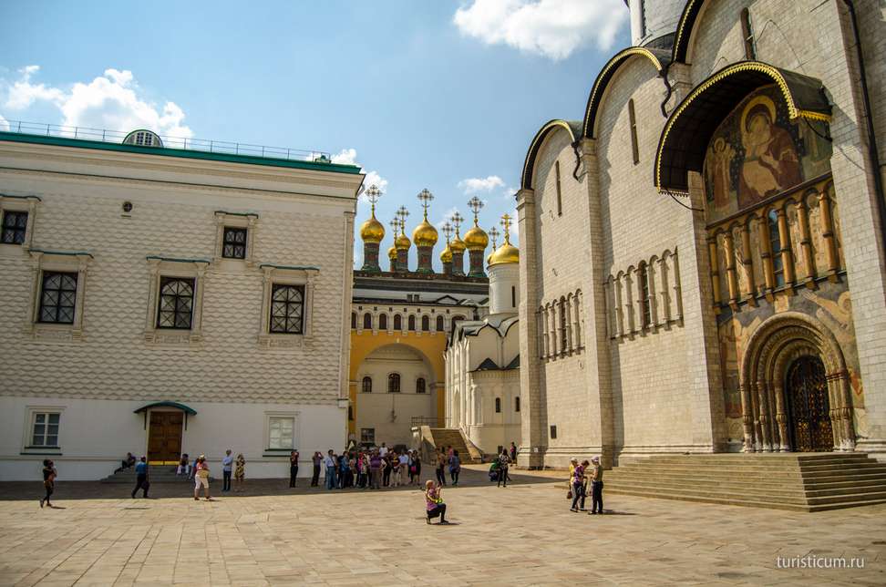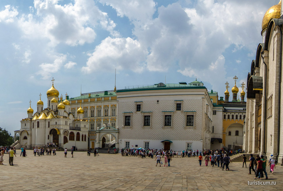 Еще одним памятником архитектуры является Грановитая палата. Это одно из древнейших гражданских зданий в Москве. Построено оно было в XV веке, а называется так из-за восточного фасада, стена которого отделана гранёным рустом.
