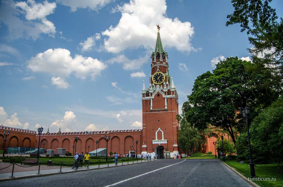 Прогулявшись по тени прекрасного сквера мы как раз выходим к Спасской башне, которая выведет нас прямо на Красную площадь Кремля.