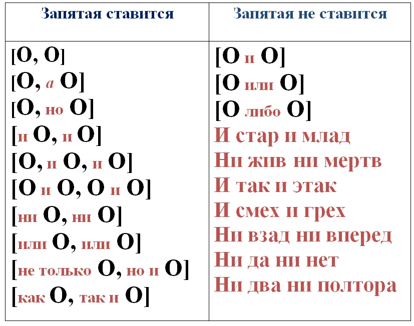 Рассмотри таблицу. Запомни фразеологические обороты, в которых между однородными членами предложения запятая не ставится.