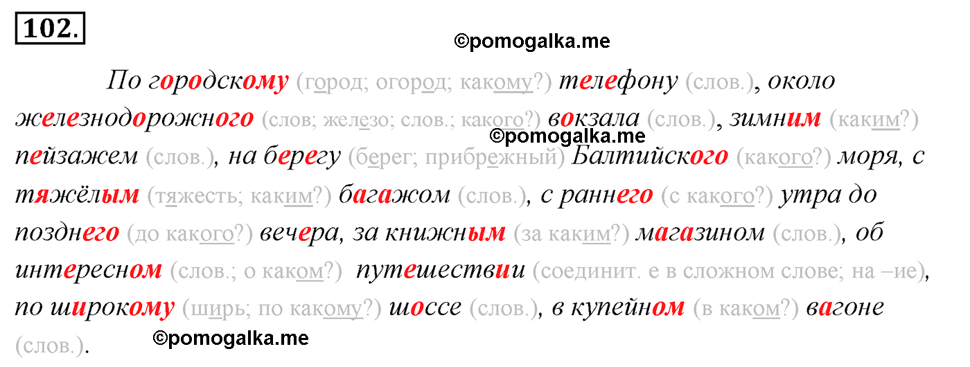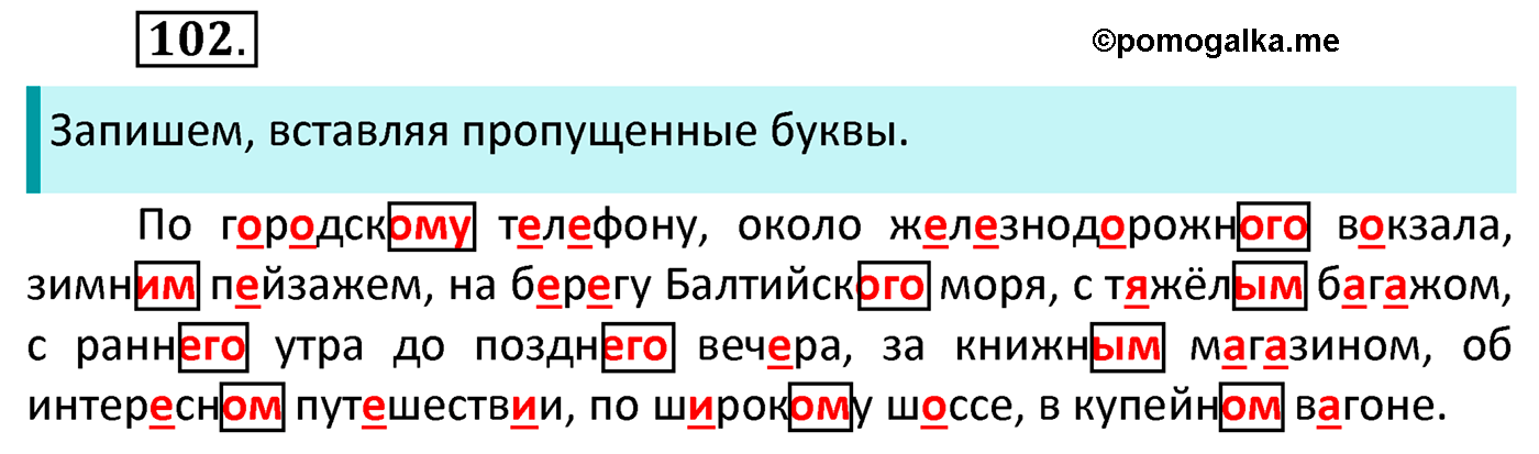 Категория: ГДЗ решебник по русскому языку. 4 класс. 2 часть. Автор В. Канакина В. Горецкий Русский язык 4 класс Канакина Горецкий 2 часть Онлайн учебник и решебник (гдз)Упражнение № 102. Прочитайте. По (г. дской) т. фону, около (ж. знод. рожный) в. кзала, (зимний) п. йзажем, на б. гу (Балтийский) моря, с (т. жёлый) б. жом, с (ранний) утра до (поздний) веч. ра, за (книжный) м. зином, об (интересный) пут. шеств. и, по (ш. рокий) ш. ссе, в (купейный) в. гоне. • Спишите, согласуя имена прилагательные с именами существительными и вставляя пропущенные буквы. Докажите, что задание выполнено верно. Ответ (гдз) к упражнению № 102 (Русский язык 4 класс Канакина )По городскому телефону, около железнодорожного вокзала, зимним пейзажем, на берегу Балтийского моря, с тяжёлым багажом, с раннего утра до позднего вечера, за книжным магазином, об интересном путешествии, по широкому шоссе, в купейном вагоне.