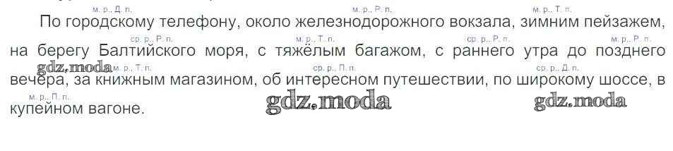 По городскому телефону (Д. п.), около железнодорожного вокзала (Р. п.), зимним пейзажем (Т. п.), на берегу Балтийского моря (Р. п.), с тяжёлым багажом (Т. п.), с раннего утра (Р. п.) до позднего вечера (Р. п.), за книжным магазином (Т. п.), об интересном путешествии (П. п.), по широкому шоссе (Д. п.), в купейном вагоне (П. п.).