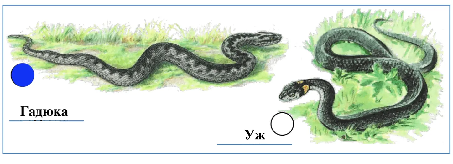 На каком рисунке изображена гадюка? Закрасьте кружок. Какая змея показана на другом рисунке? Если не знаете, посмотрите в атласе-определителе «От земли до неба». Подпишите названия обеих змей. Используя рисунок и информацию из атласа-определителя, сравните этих змей. Сделайте записи на с. 16.