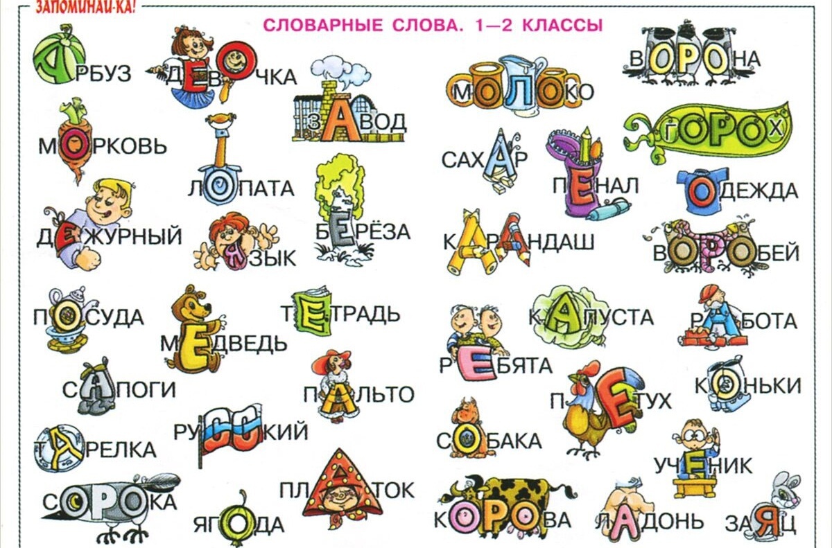 Каждая программа для начальной школы предлагает к изучению свой список словарных слов. Если объединить все списки, то получится следующий перечень: