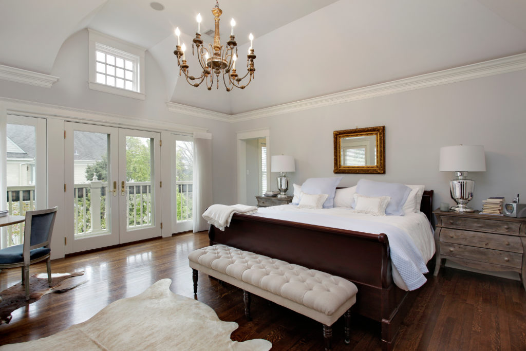 Master bedroom in luxury home with doors to balcony