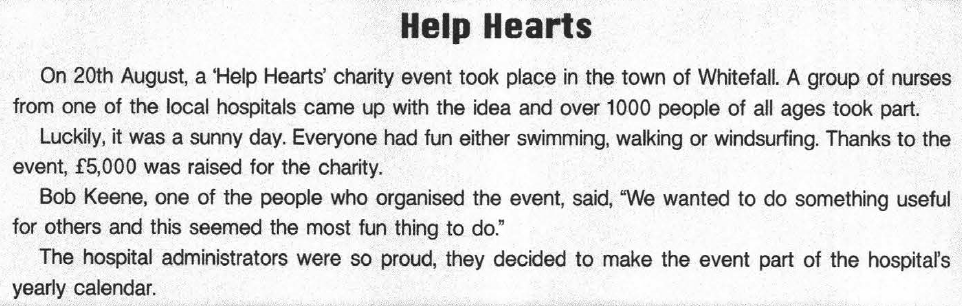 A). 1‑interview 2‑cartoon 3‑news 4‑weather report 5‑Chat show.В). 6‑gossip 7‑music 8‑text messages 9‑fashion 10‑Horoscopes.С). 11‑ran off 12‑surprised 13‑broke 14‑off 15‑bravely 16‑up 17‑report 18‑advice 19‑exciting 20‑attractive.D). 21‑were you doing 22‑was working 23‑was taking 24‑were planning 25‑were studying.Е). 26‑played 27‑was travelling 28‑got dressed 29‑was cooking 30‑was riding 31‑did 32‑went 33‑passed 34‑found 35‑were you doing.F). 36‑С 37‑Е 38‑А 39‑В 40‑DG). 41‑Help Hearts 42‑A group of nurses. 43‑Over 1,000 people. 44‑It was sunny. 45‑£5,000 was raised./The hospital administrators decided to make it part of the hospital’s yearly calendar.H). 46‑3 47‑4 48‑6 49‑5 50‑2