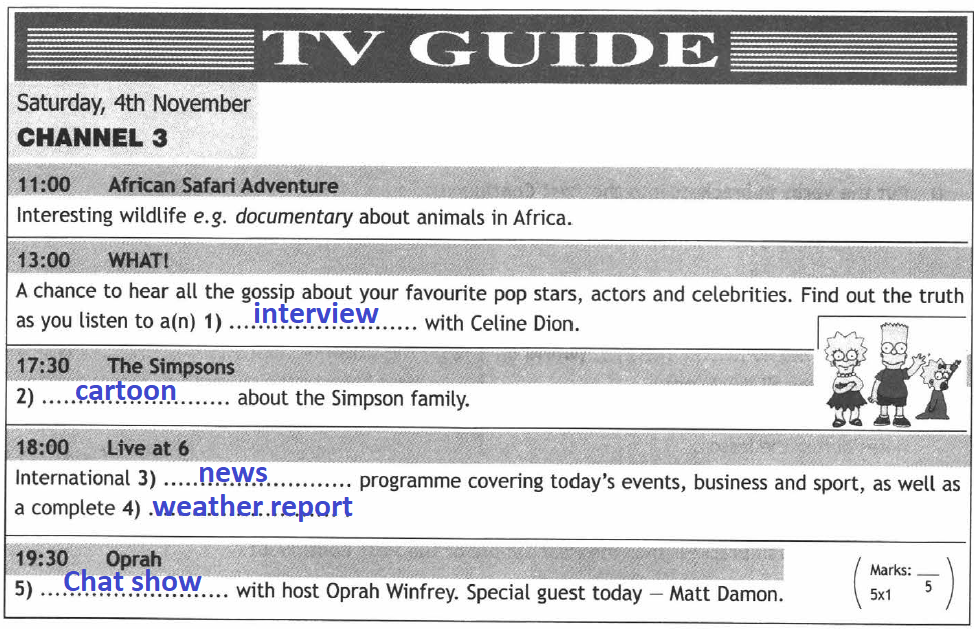 A). Fill in the correct word/phrase.• news • interview • cartoon • documentary • weather report • chat show