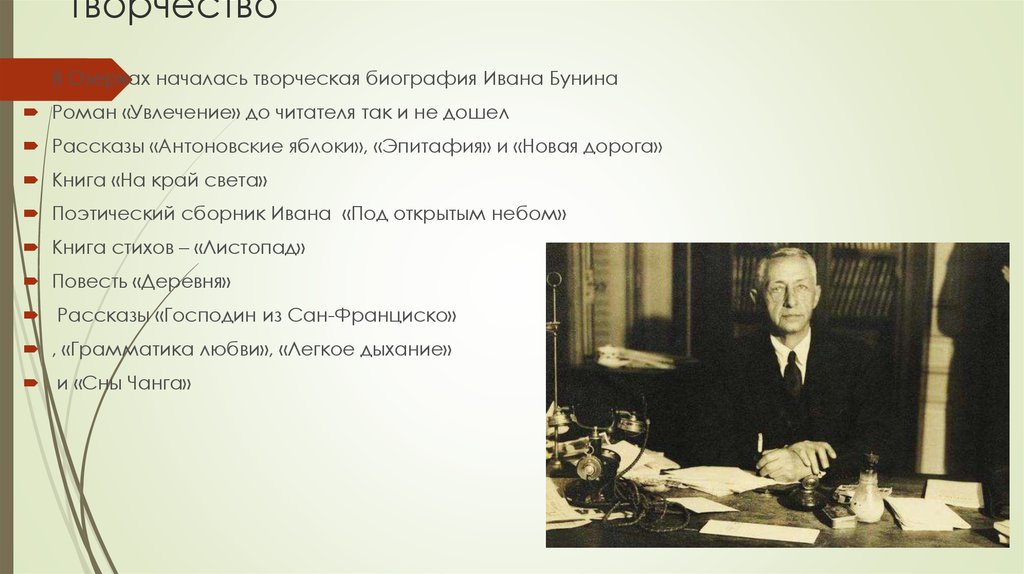 Прибыв во Францию, Бунин несколько лет ничего не писал, хотя его книги с дореволюционными произведениями выходили. Только в 1924 г. вышел сборник «Роза Иерихона», в который вошли рассказы, созданные в Париже. Через год в «Современных записках» вышла повесть «Митина любовь», после — «Солнечный удар», «Ида», «Дело корнета Елагина». В 1927 г. Бунин приступает к работе над «Жизнью Арсеньева».
