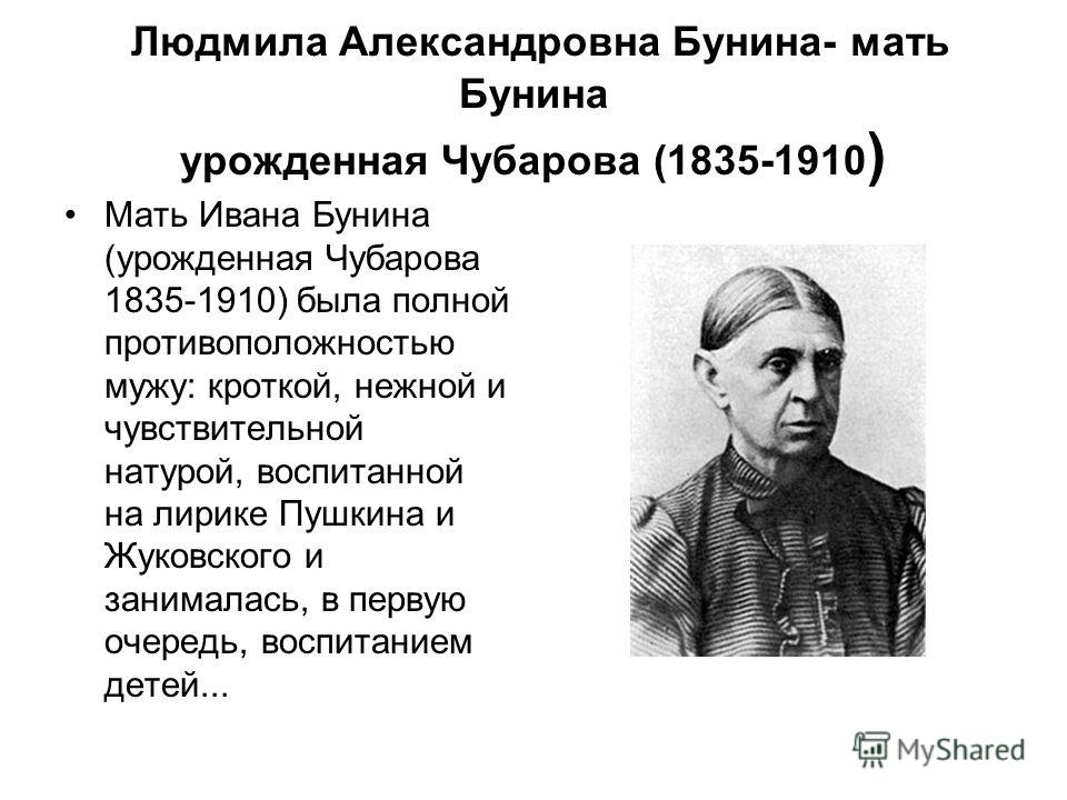 1870, 10 октября — родился в Воронеже, в семье мелкопоместного дворянина Алексея Николаевича Бунина и Людмилы Александровны, урожденной княгини Чубаровой. Детство прошло «в одном из небольших родовых поместий», на хуторе Бутырки Елецкого уезда Орловской губернии.