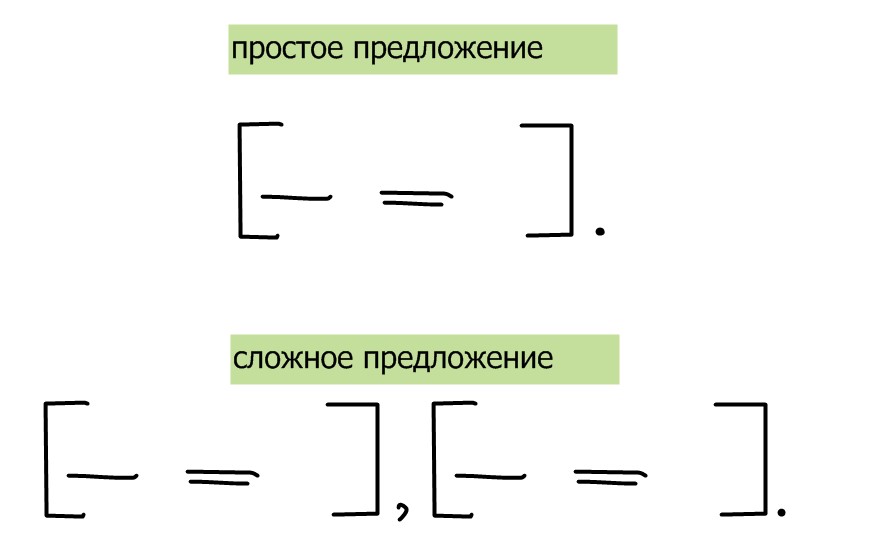 - Простые предложения заключайте в квадратные скобки, так как они являются равнозначными фрагментами сложных или бессоюзных комплексов;
