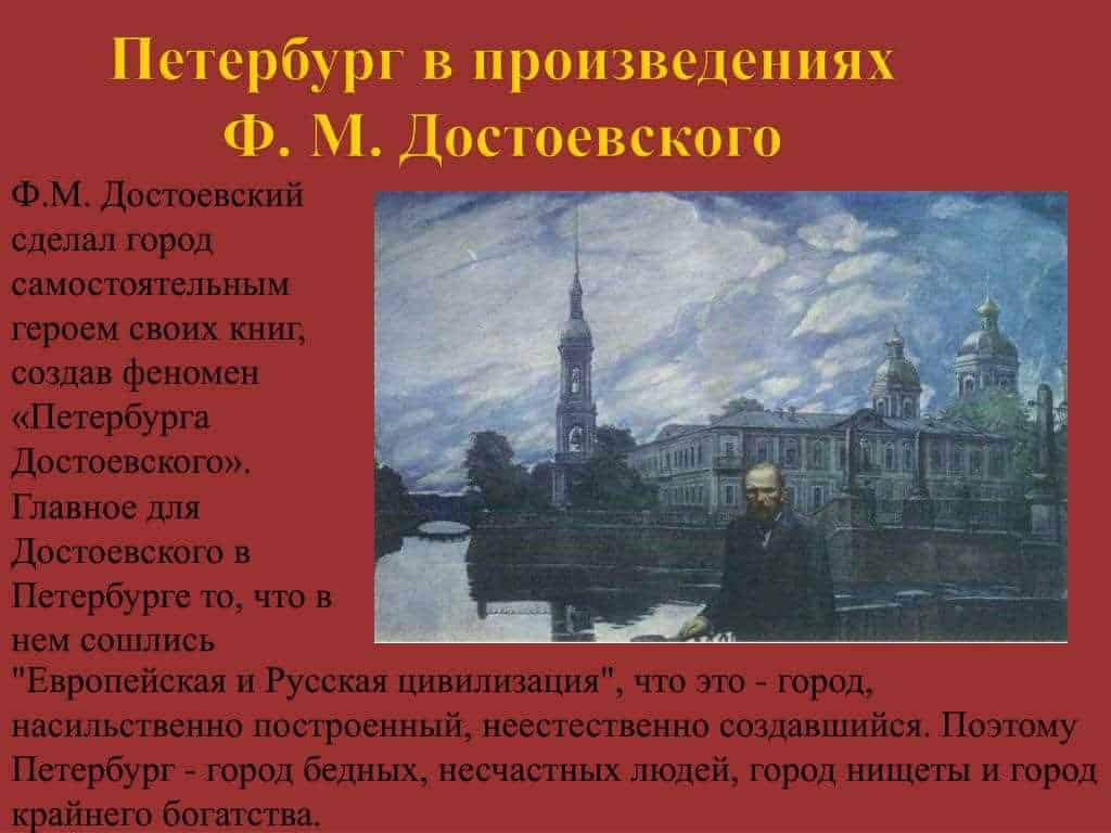 Портрет города, находящегося на стыке Европы и Азии, пропитанного историей и архитектурой, очерчивается в романах и рассказах Достоевского. Кроме того, Санкт-Петербург является исконно русским городом, в котором противостоят различные социальные слои и моральные противоречия.