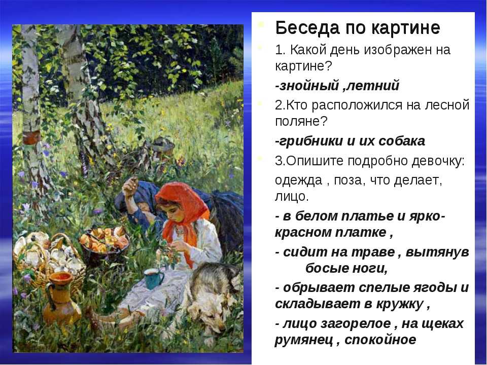 Мне кажется, день задался теплый и солнечный. Обе героини легко одеты, а головы у них покрыты платками — защищают от теплового удара и назойливых лесных насекомых. Интересно, почему девочка решила надеть красный платок? Наверное, ее об этом попросила мама, чтобы видеть непоседу издалека.