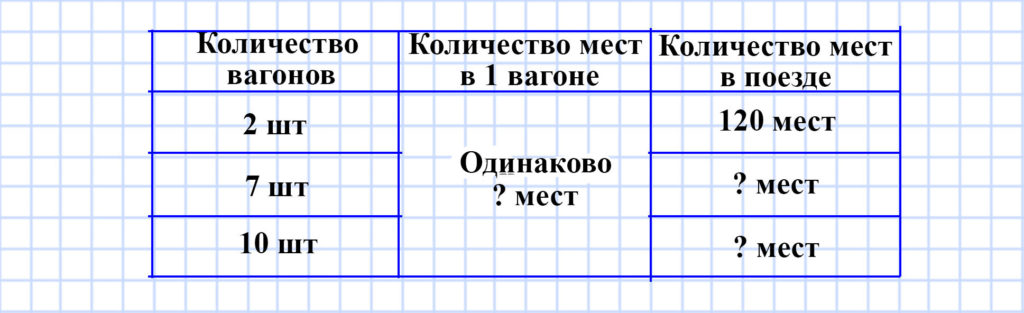 В 2 одинаковых спальных вагонах поезда 120 мест. Сколько мест в 7 таких вагонах? В 10 таких вагонах?