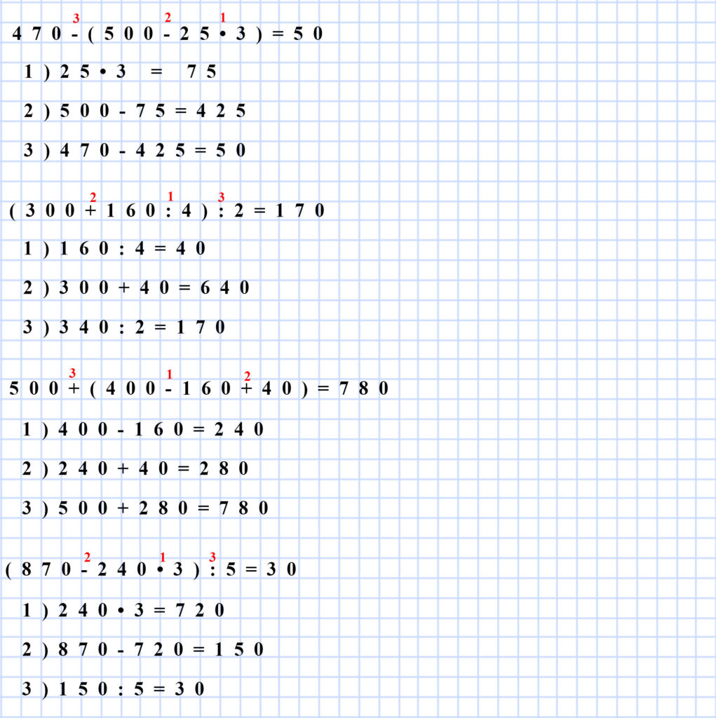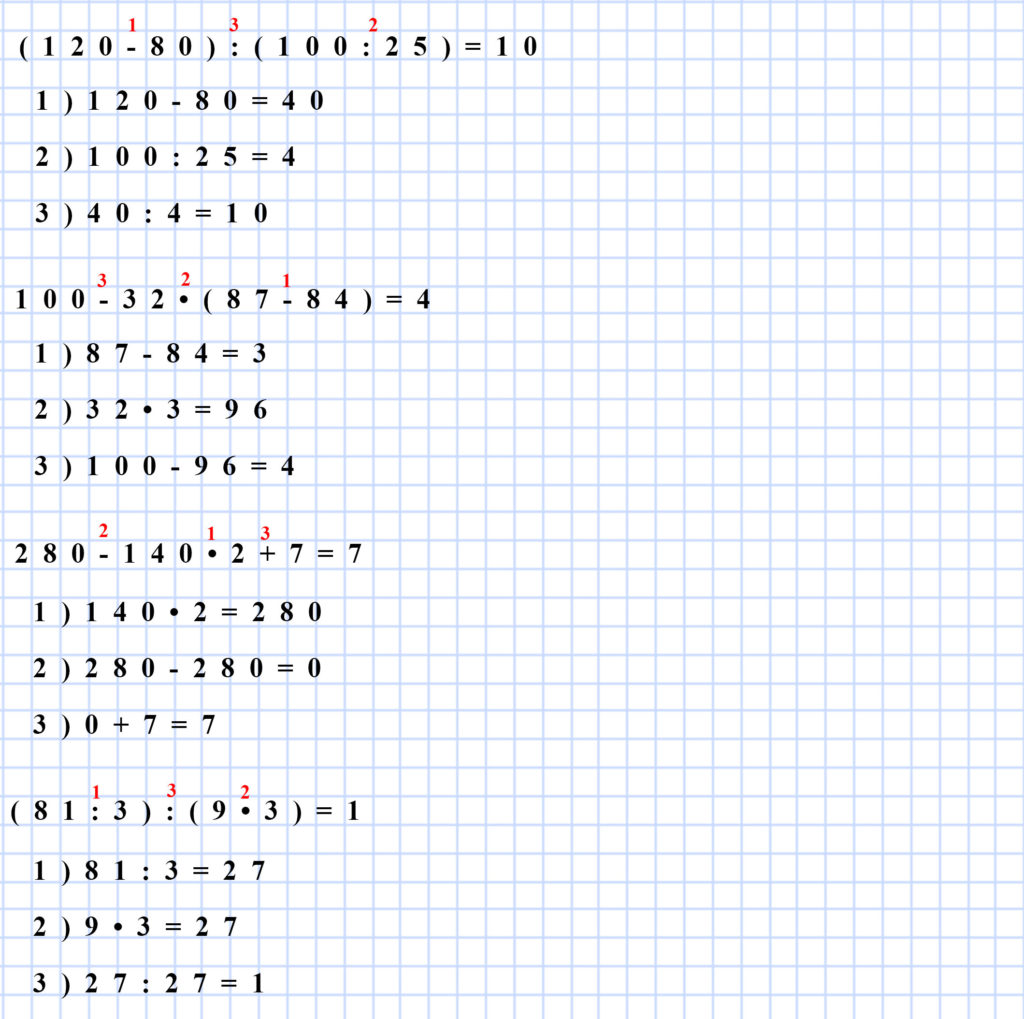 Пока порядок выполнения действий не заучен твердо, можно ставить над знаками арифметических действий цифры, означающие порядок вычисления. Например, для задачи выше мы могли бы записать так: