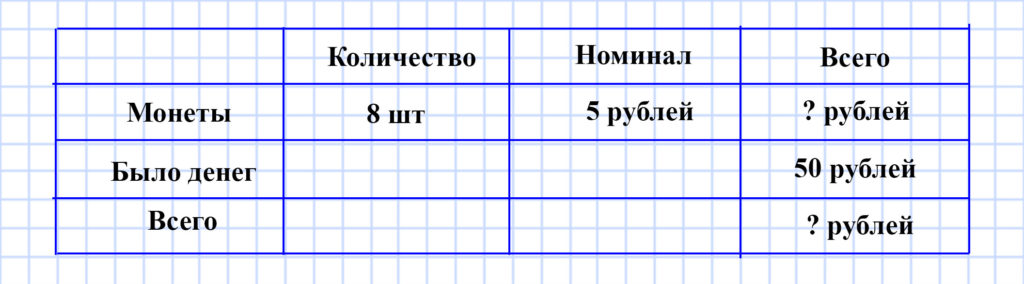 У Нины было 50 р. и ещё 8 монет, по 5 р. каждая. Сколько денег было у Нины?