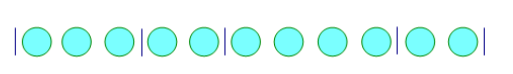 В этом примере в первой коробке 3 шара, во второй — 2, в третьей — 4, и в четвертой — 2. Переставляя шары и перегородки, мы получаем различные комбинации шаров в коробках. Например, переставив последний шар в первой коробке и первую внутреннюю перегородку, мы получим такую комбинацию: