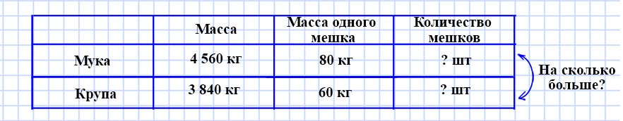 На склад привезли 4 560 кг муки в мешках, по 80 кг в каждом, и 3 840 кг крупы в мешках, по 60 кг в каждом. На сколько больше привезли мешков с крупой, чем с мукой?
