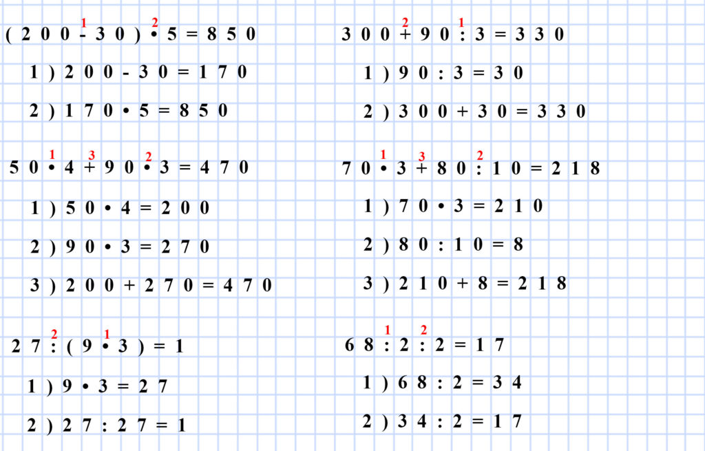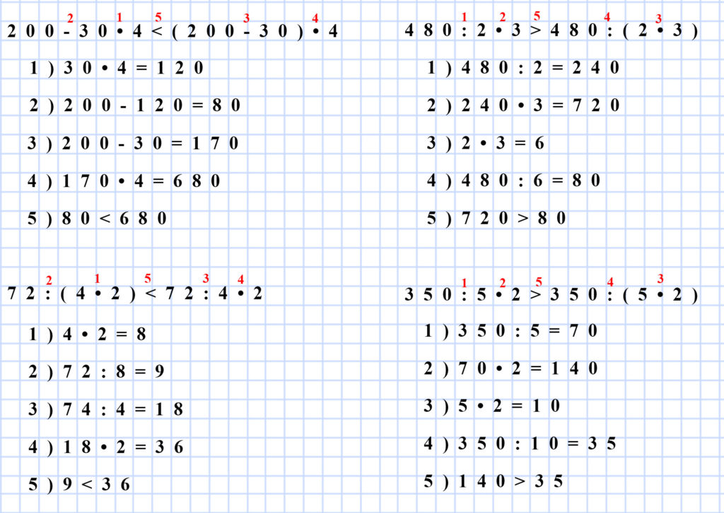 200 − 30 • 4 = 200 − 120 = 80 (200 − 30) • 4 = 170 • 4 = 680 200 − 30 • 4 480 : (2 • 3)