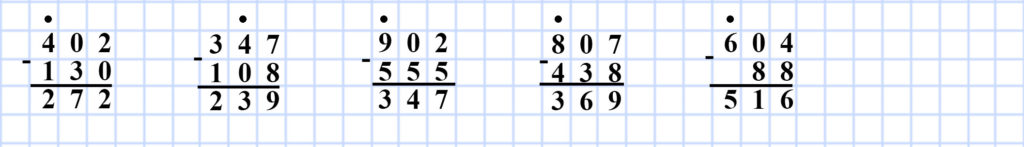 Вычитаем 103 и 402. 2 − 0 = 2, пишем 2. Из нуля 3 вычесть нельзя. Вычтем 3 из 10, заняв десяток у 4 и запишем 7, тогда единицу вычтем не из 4, а из 3, пишем 2.