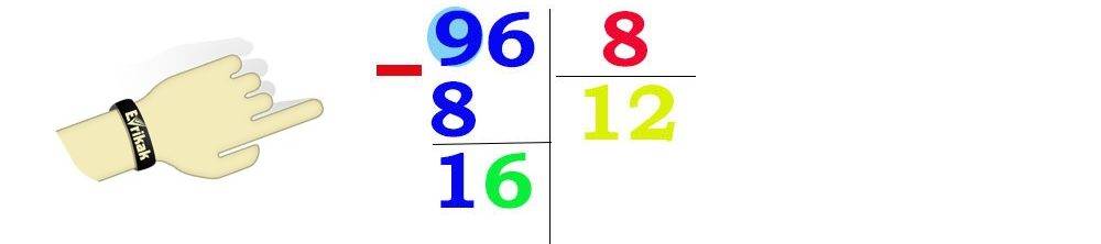 - Попросите снова ребенка определить цифру, которая больше делителя 8. Как видим, число 1 меньше 8. Поэтому нам следует объединить его со следующей цифрой делимого числа – 6.