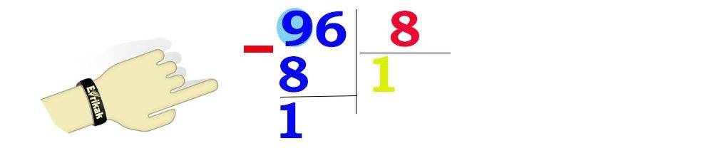 - Далее, умножьте делитель 8 на результат 1. Полученную цифру 8 запишите под первой цифрой делимого числа.