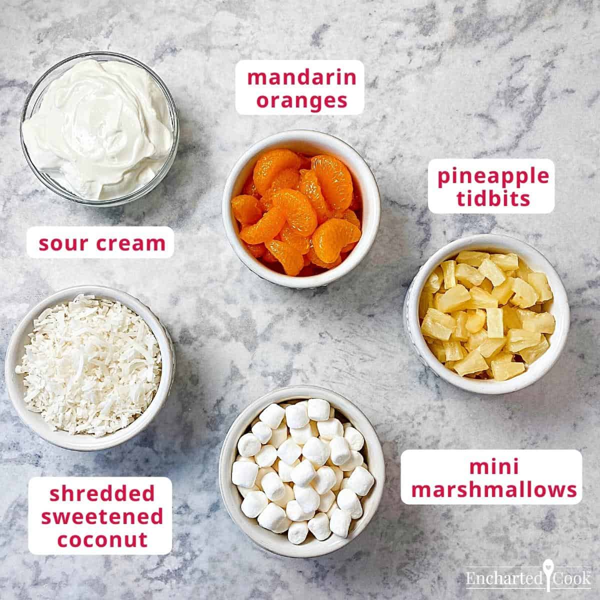 1 Cup Sour Cream, 1 Cup Mandarin Oranges, 1 Cup Pineapple Tidbits, 1 Cup Mini Marshmallows, 1 Cup Shredded Sweetened Coconut
