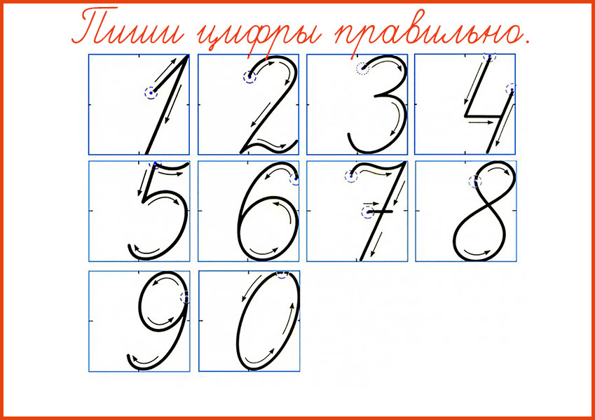 Это пособие пригодится вам уже после того, как ребенок выучит и хорошо запомнит 10 печатных цифр. Чтобы ребенок научился правильно писать прописные цифры, необходимо сначала на наглядном примере продемонстрировать малышу последовательность их написания по стрелочкам. Положите бланк на столике перед ребенком, возьмите ручку или карандаш, и начните обводить первую цифру от указанной точки по направлению стрелочек, затем предложите малышу сделать то же самое. Затем вторую, третью и так далее, в зависимости от того, как быстро ребенок запоминает последовательность написания.